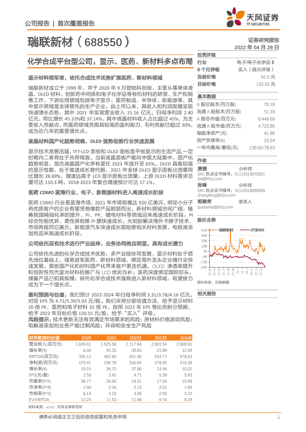 【天风证券】【20220428】20220428-天风证券-瑞联新材-688550.SH-化学合成平台型公司,显示、医药、新材料多点布局-34页