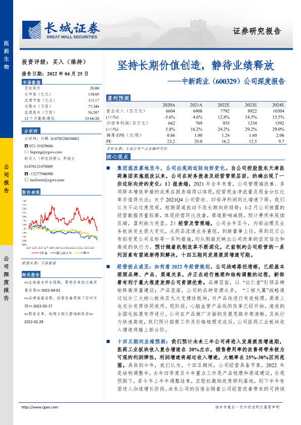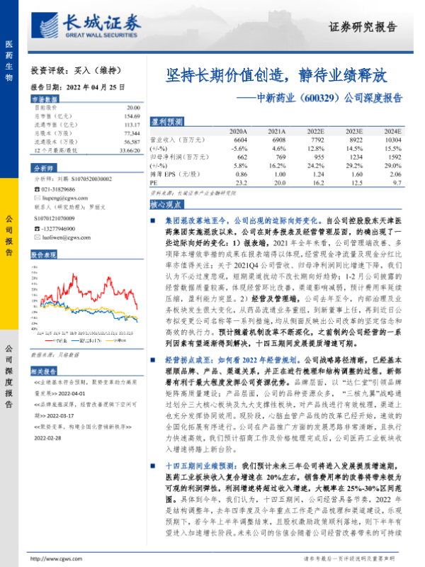 【长城证券】【20220425】20220425-长城证券-中新药业-600329.SH-公司深度报告:坚持长期价值创造,静待业绩释放-13页