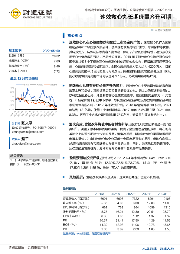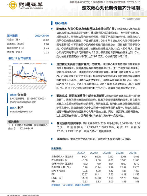 【财通证券】【20220510】20220510-财通证券-中新药业-600329.SH-速效救心丸长期价量齐升可期-17页