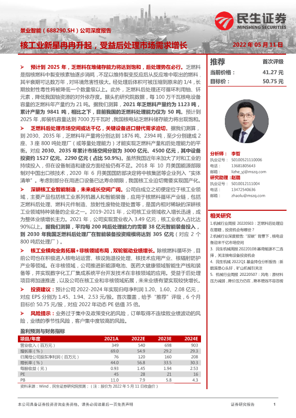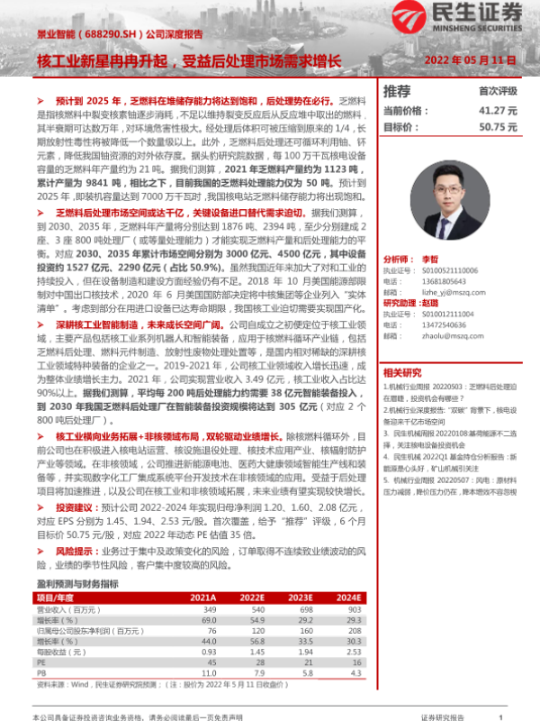 【民生证券】【20220511】景业智能(688290.SH)公司深度报告:核工业新星冉冉升起,受益后处理市场需求增长-24页