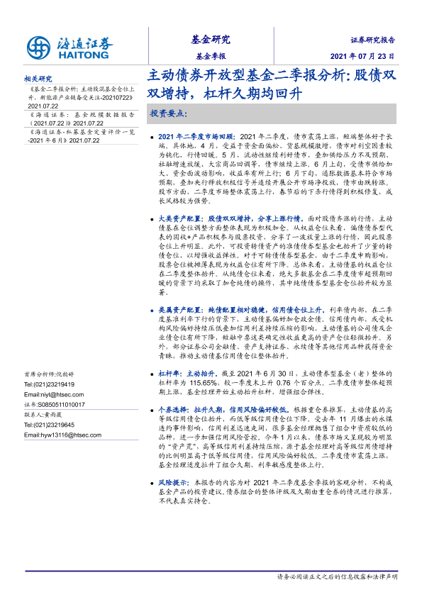 【海通证券】【20210723】主动债券开放型基金二季报分析:股债双双增持,杠杆久期均回升-10页