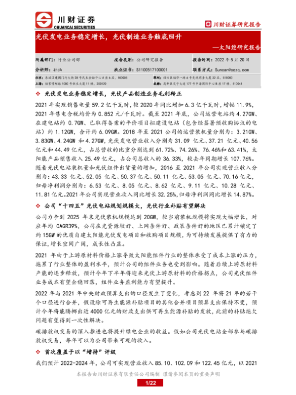 【川财证券】【20220520】太阳能研究报告:光伏发电业务稳定增长,光伏制造业务触底回升-22页