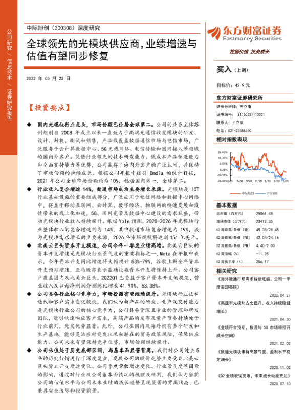 【东方财富证券】【20220523】中际旭创-300308.SZ-深度研究:全球领先的光模块供应商,业绩增速与估值有望同步修复-41页