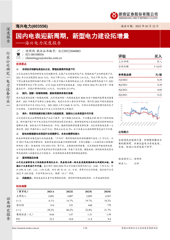 【浙商证券】【20220522】海兴电力深度报告:国内电表迎新周期,新型电力建设拓增量-30页