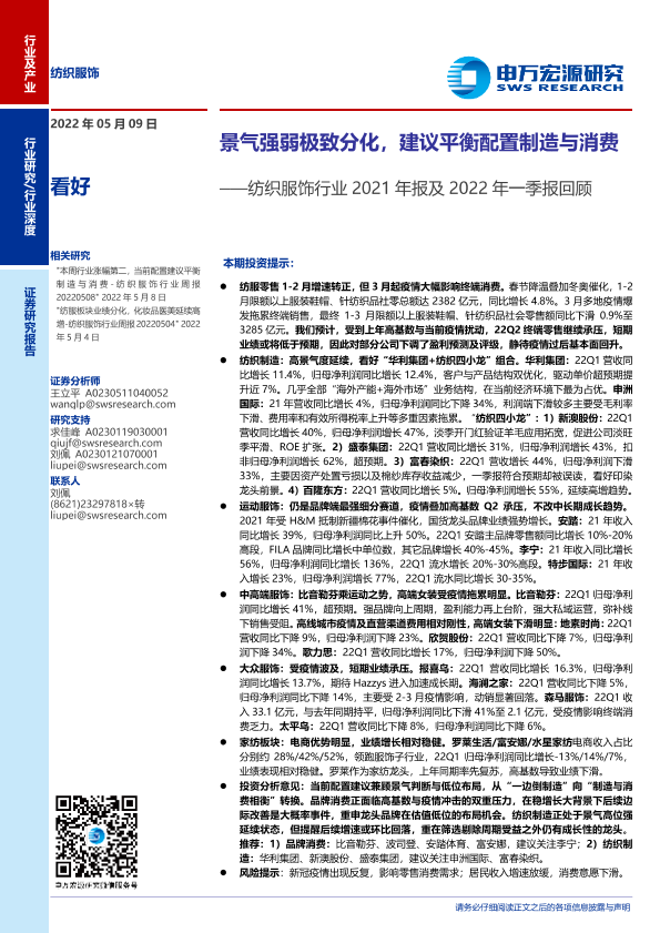 【申万宏源】【20220509】纺织服饰行业2021年报及2022年一季报回顾:景气强弱极致分化,建议平衡配置制造与消费-27页