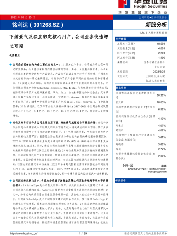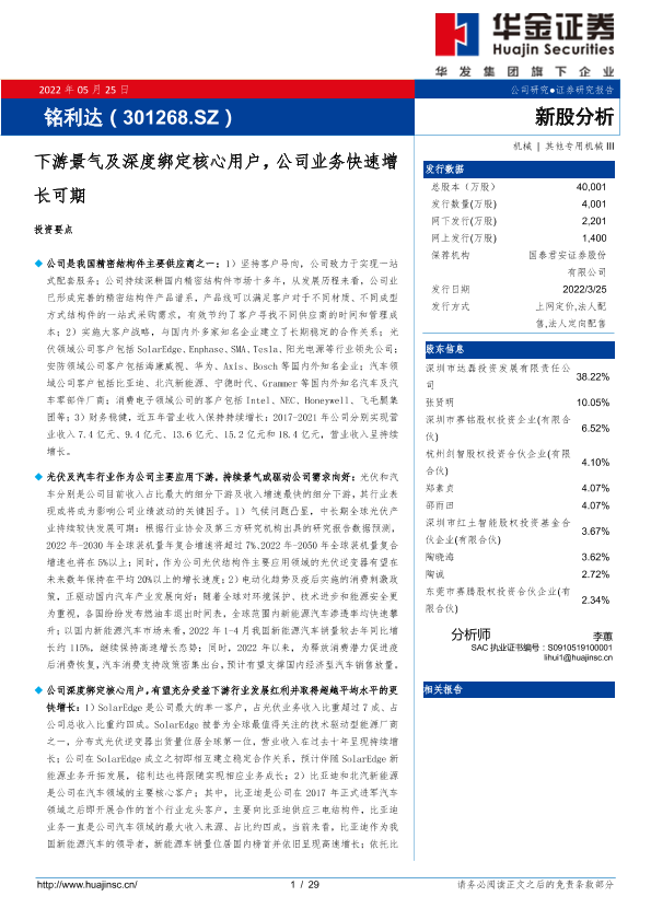 【华金证券】【20220525】铭利达(301268.SZ)新股分析:下游景气及深度绑定核心用户,公司业务快速增长可期-29页
