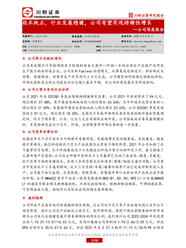 北斗导航 振芯科技 芯片技术 行业发展 财务预测