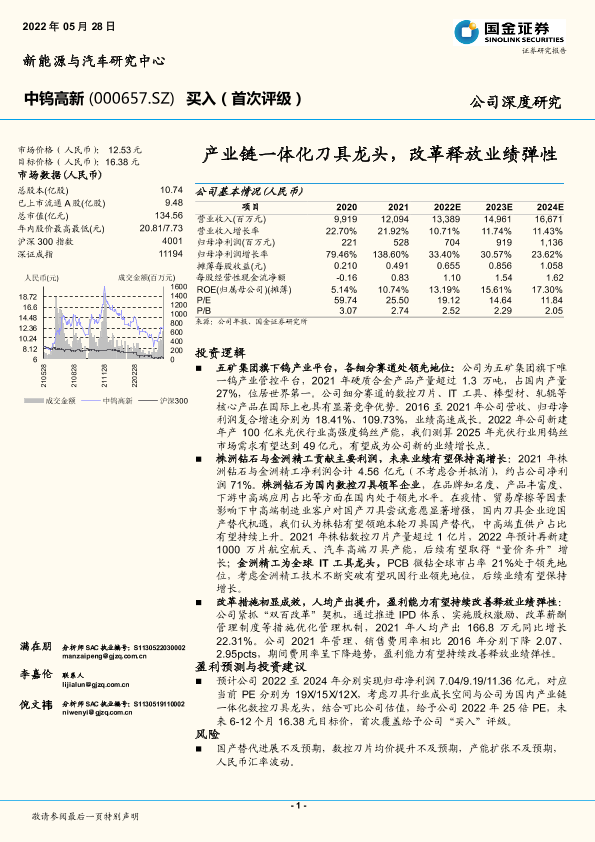 业绩预测 产业链一体化 刀具制造 国有企业改革 钨产业