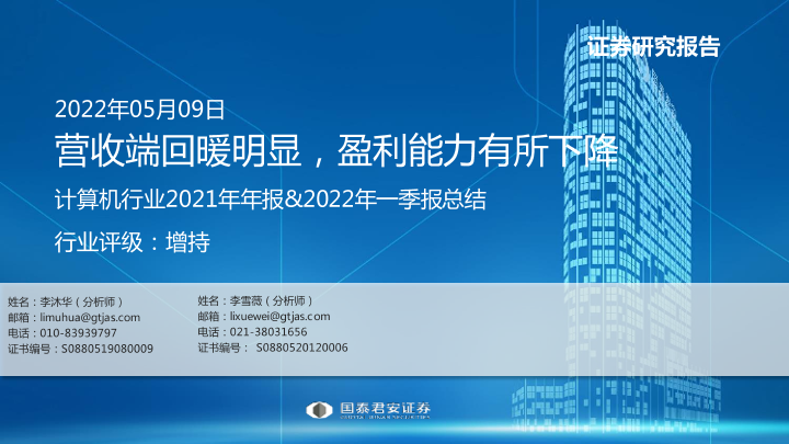 【国泰君安证券】【20220509】计算机行业2021年年报&2022年一季报总结:营收端回暖明显,盈利能力有所下降-44页