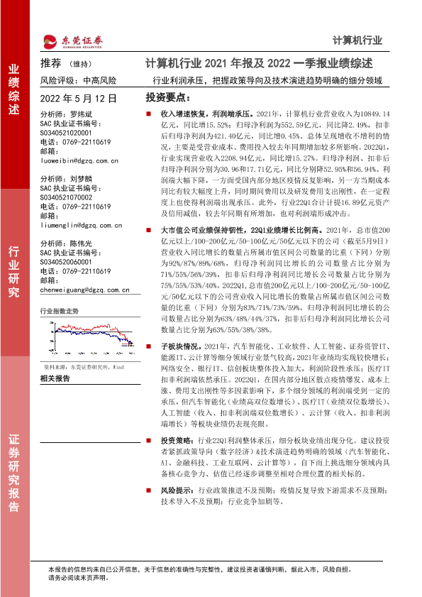 【东莞证券】【20220512】计算机行业2021年报及2022一季报业绩综述:行业利润承压,把握政策导向及技术演进趋势明确的细分领域-16页
