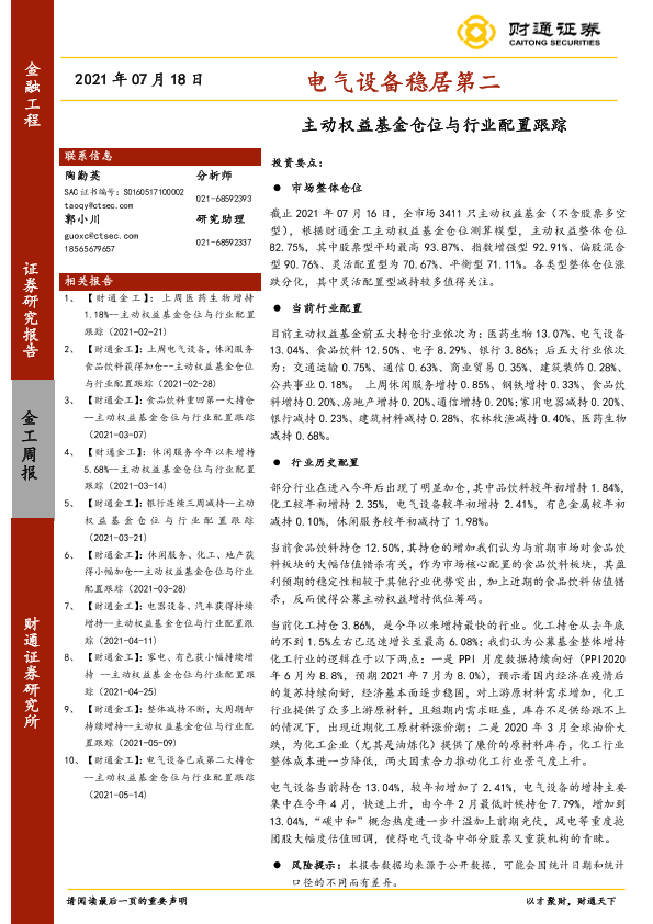 主动权益基金 仓位测算 电气设备 行业配置 财通证券