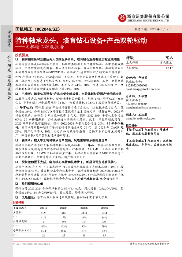 【浙商证券】【20220609】国机精工深度报告:特种轴承龙头,培育钻石设备+产品双轮驱动-41页