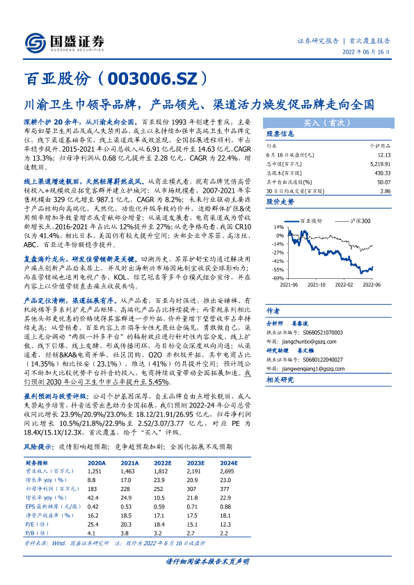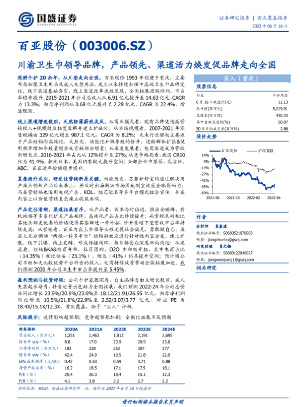 【国盛证券】【20220616】20220616-国盛证券-百亚股份-003006.SZ-川渝卫生巾领导品牌,产品领先、渠道活力焕发促品牌走向全国-48页