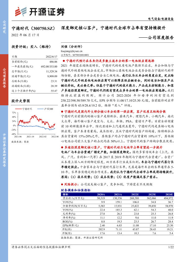 【开源证券】【20220617】20220617-开源证券-宁德时代-300750.SZ-公司深度报告:深度绑定核心客户,宁德时代全球市占率有望持续提升-22页