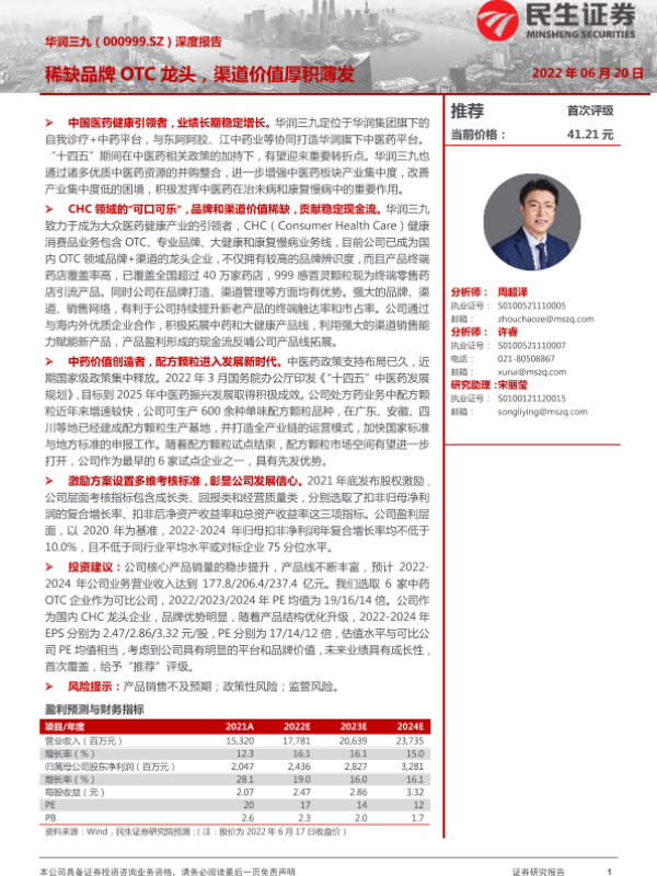 【民生证券】【20220620】20220620-民生证券-华润三九-000999.SZ-深度报告:稀缺品牌OTC龙头,渠道价值厚积薄发-40页