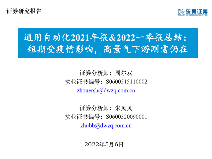 【东吴证券】【20220506】通用自动化行业2021年报&2022一季报总结:短期受疫情影响,高景气下游刚需仍在-49页