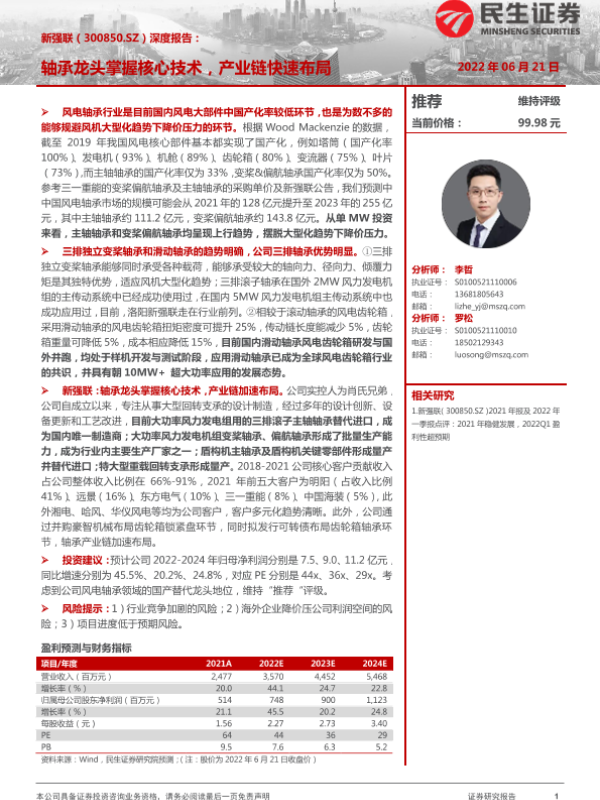 【民生证券】【20220621】新强联(300850.SZ)深度报告:轴承龙头掌握核心技术,产业链快速布局-40页