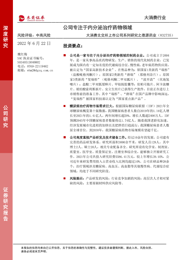【东莞证券】【20220622】大消费北交所上市公司系列研究之德源药业:公司专注于内分泌治疗药物领域-20页