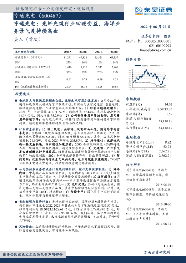 【东吴证券】【20220622】亨通光电:光纤光缆行业回暖受益,海洋业务景气度持续高企-41页