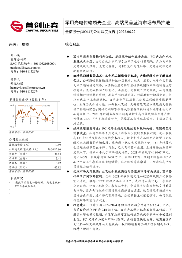 【首创证券】【20220622】全信股份-300447.SZ-公司深度报告:军用光电传输领先企业,高端民品蓝海市场布局推进-26页
