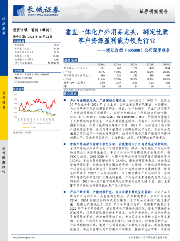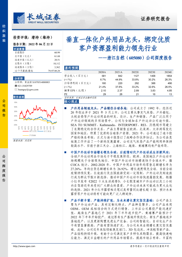【长城证券】【20220622】20220622-长城证券-浙江自然-605080.SH-公司深度报告:垂直一体化户外用品龙头,绑定优质客户资源盈利能力领先行业-32页
