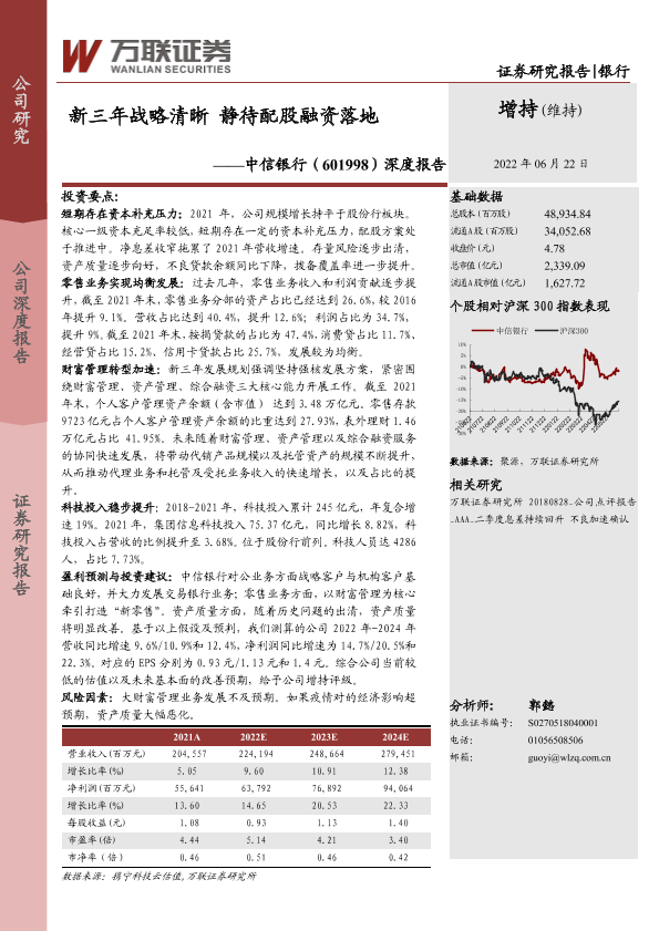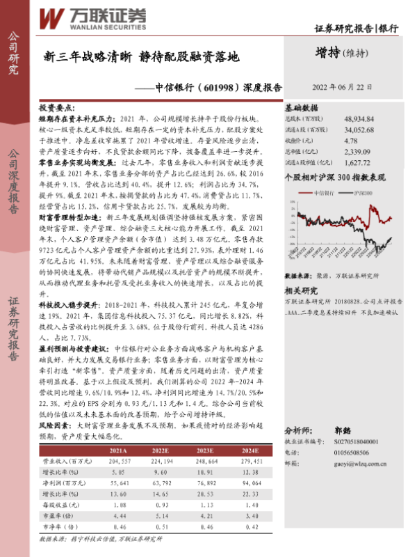 【万联证券】【20220622】20220622-万联证券-中信银行-601998.SH-深度报告:新三年战略清晰 静待配股融资落地-15页