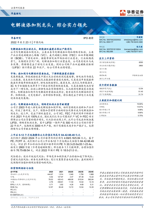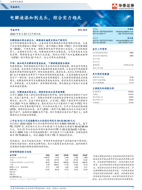 【华泰证券】【20220623】华盛锂电-电解液添加剂龙头,综合实力领先-47页