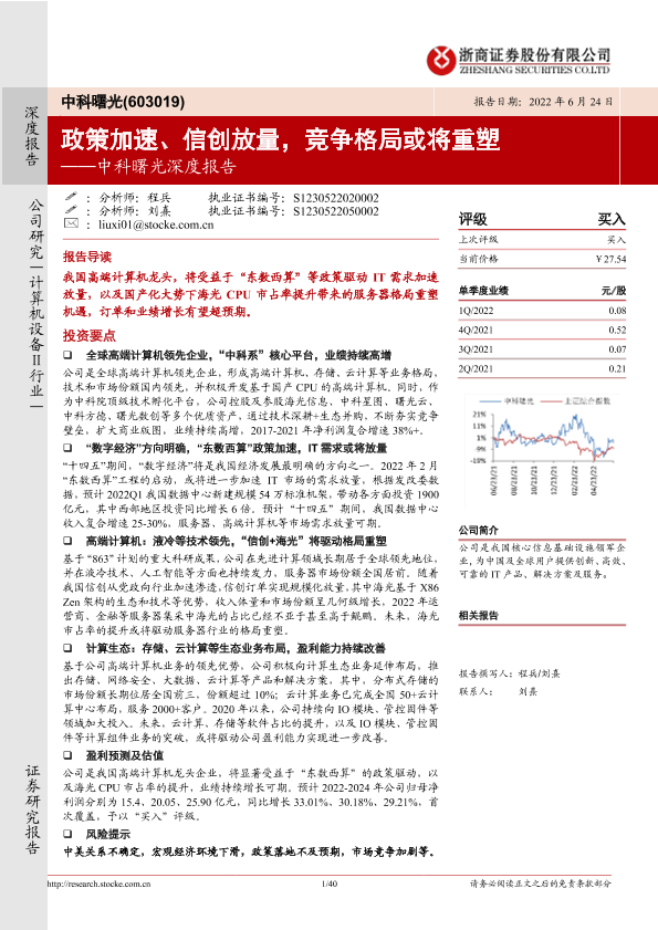 【浙商证券】【20220624】20220624-浙商证券-中科曙光深度报告:政策加速、信创放量,竞争格局或将重塑-40页