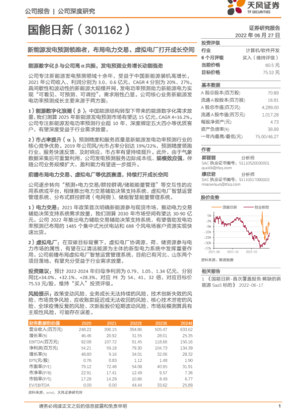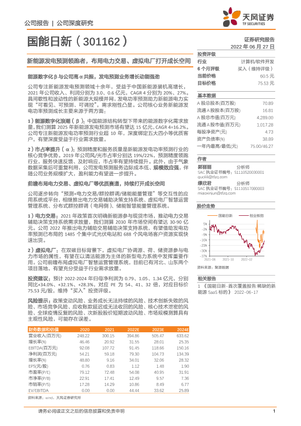 【天风证券】【20220627】国能日新-301162.SZ-新能源发电预测领跑者,布局电力交易、虚拟电厂打开成长空间-26页