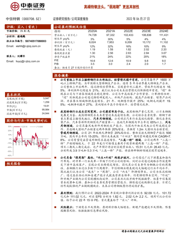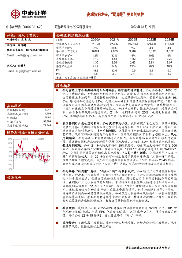 【中泰证券】【20220627】20220627-中泰证券-中信特钢-000708.SZ-高端特钢龙头,“弱周期”更显其韧性-20页