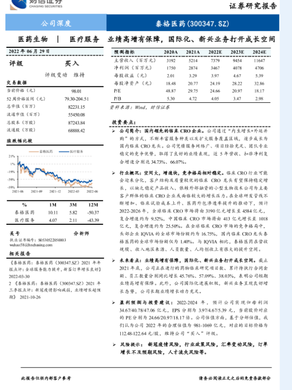 临床CRO 医疗服务 医药生物 国际化 新兴业务