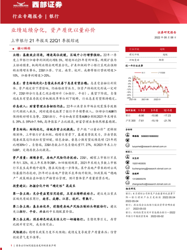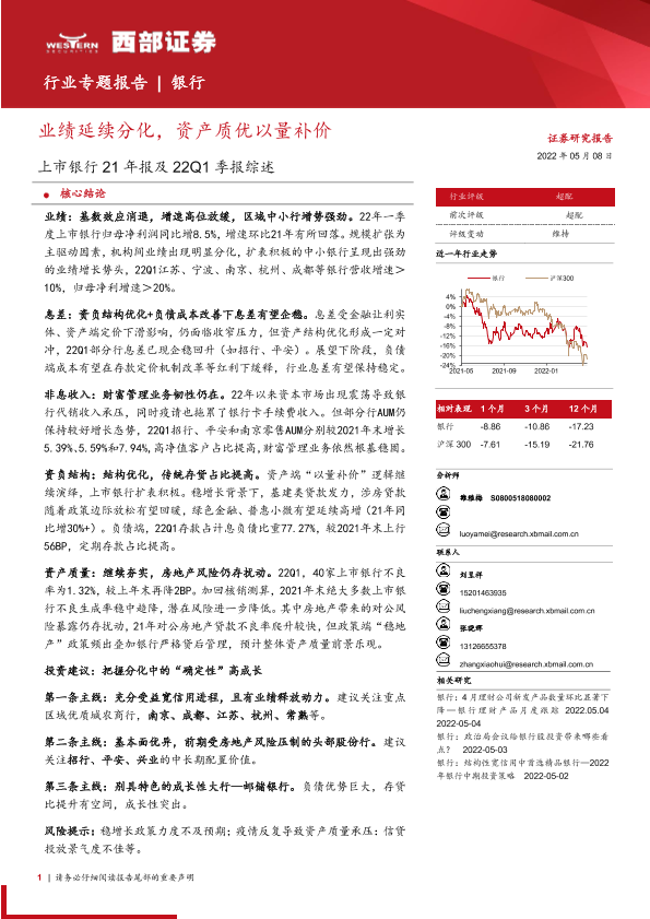 【西部证券】【20220508】银行业上市银行21年报及22Q1季报综述:业绩延续分化,资产质优以量补价-22页