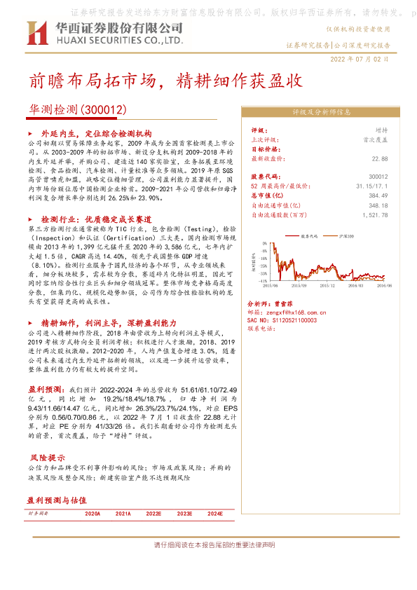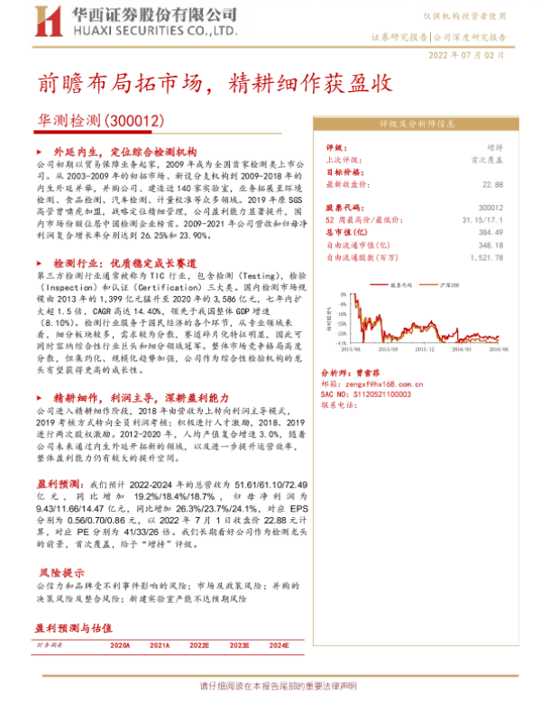 TIC行业 华测检测 市场拓展 盈利预测 第三方检测