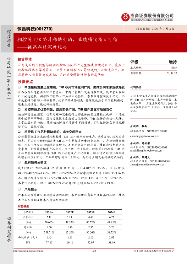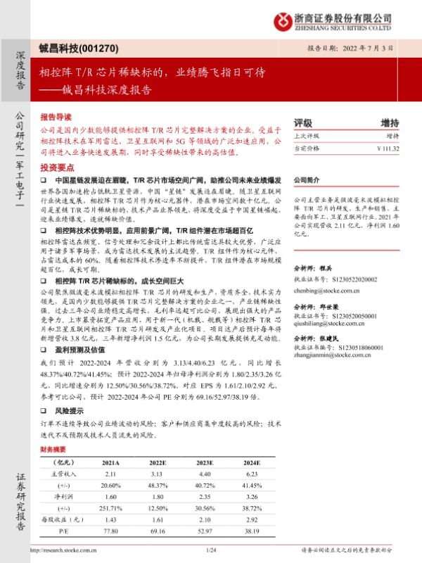 【浙商证券】【20220703】铖昌科技深度报告:相控阵T/R芯片稀缺标的,业绩腾飞指日可待-24页