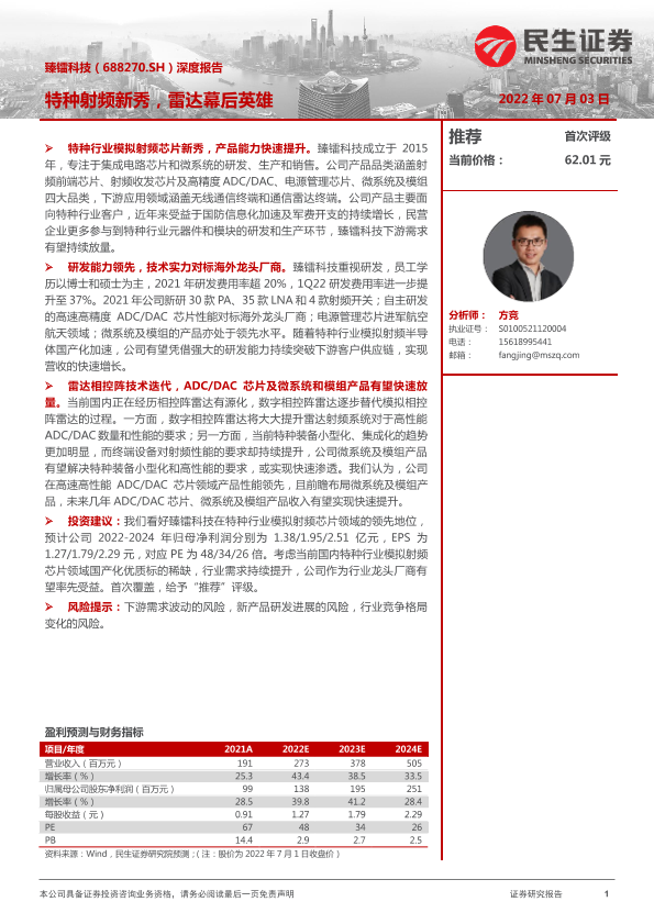 【民生证券】【20220703】臻镭科技-688270.SH-深度报告:特种射频新秀,雷达幕后英雄-41页