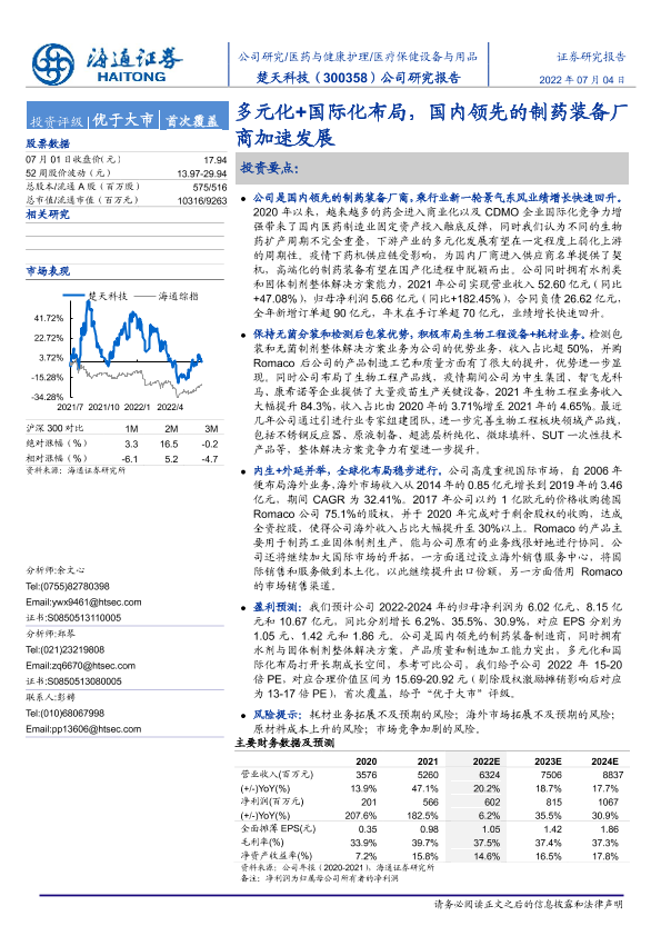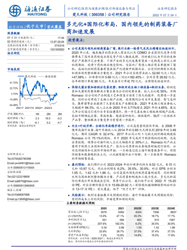 【海通证券】【20220704】20220704-海通证券-楚天科技-300358.SZ-公司研究报告:多元化+国际化布局,国内领先的制药装备厂商加速发展-23页