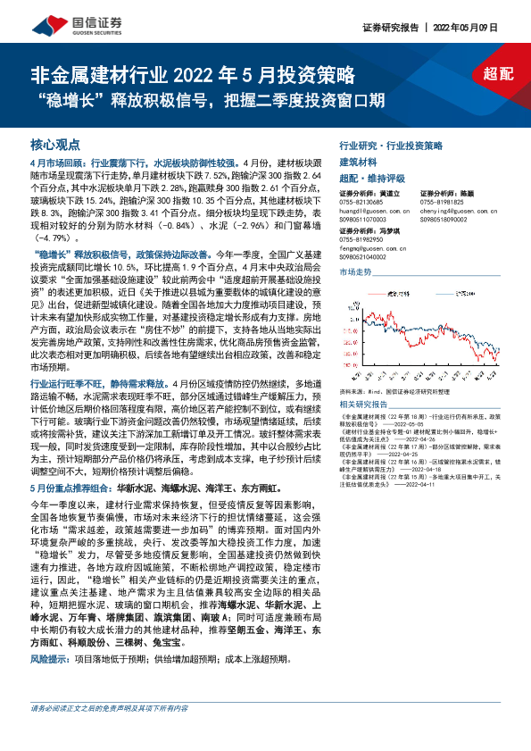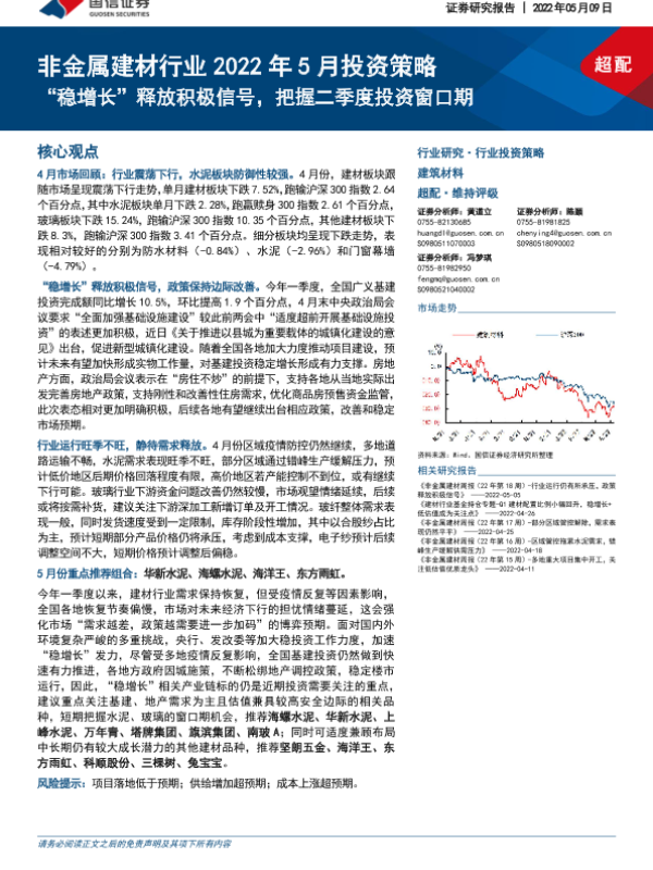 【国信证券】【20220509】非金属建材行业2022年5月投资策略:“稳增长”释放积极信号,把握二季度投资窗口期-27页