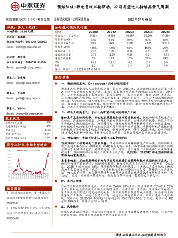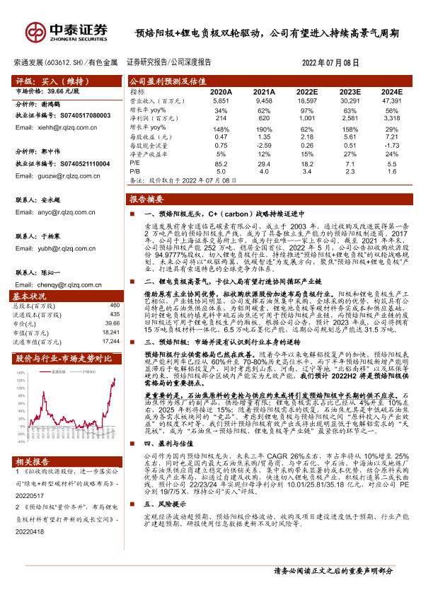 【中泰证券】【20220708】20220708-中泰证券-索通发展-603612.SH-预焙阳极+锂电负极双轮驱动,公司有望进入持续高景气周期-26页