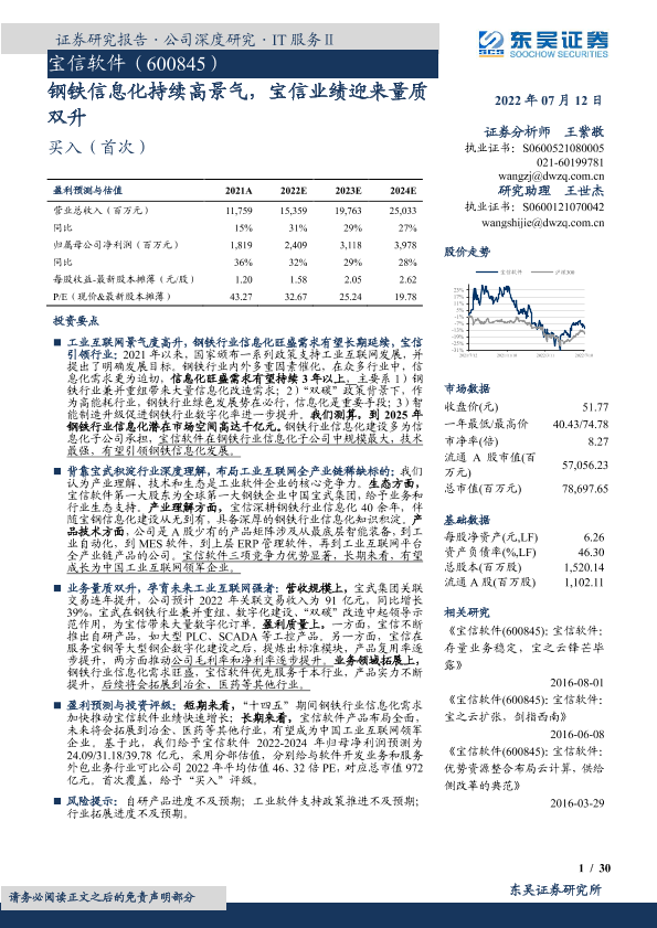 【东吴证券】【20220712】钢铁信息化持续高景气,宝信业绩迎来量质双升-30页