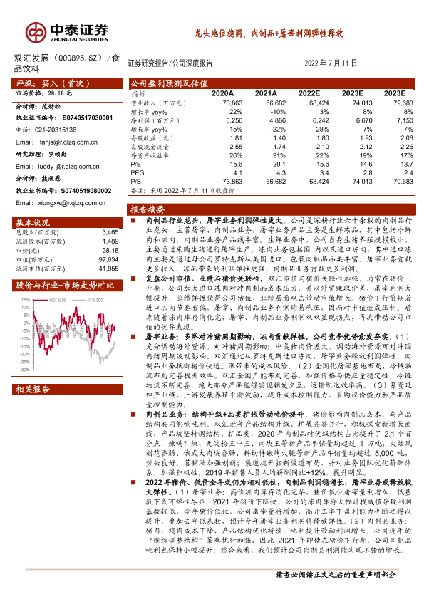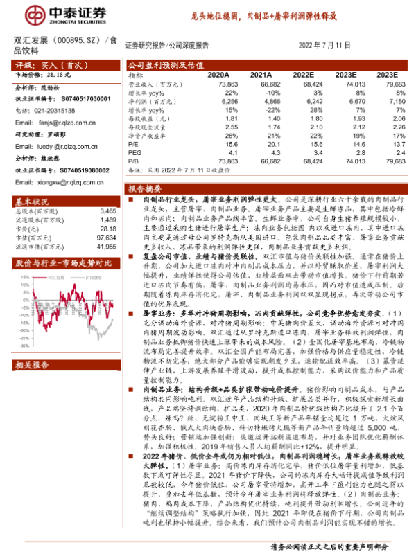 【中泰证券】【20220711】双汇发展-000895.SZ-龙头地位稳固,肉制品+屠宰利润弹性释放-24页
