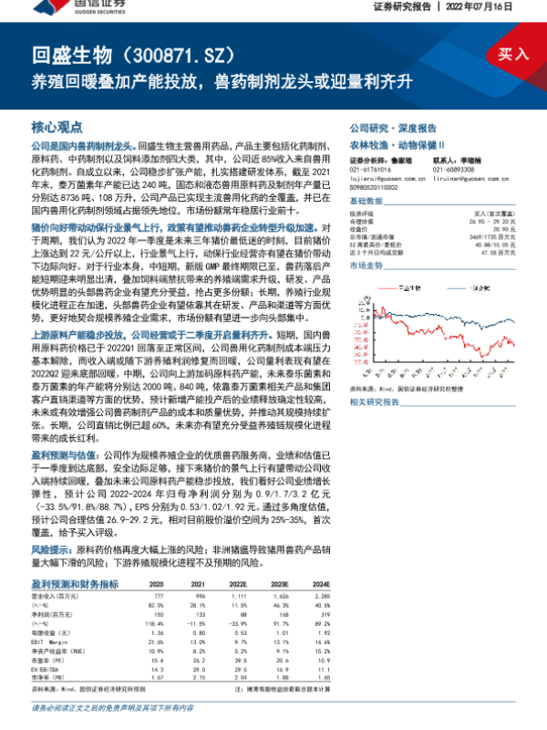 【国信证券】【20220716】养殖回暖叠加产能投放,兽药制剂龙头或迎量利齐升-30页