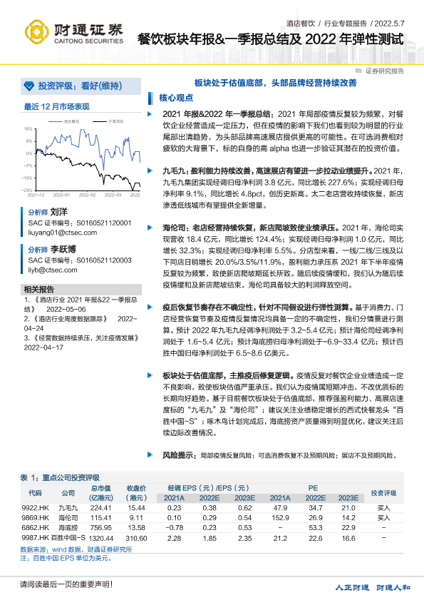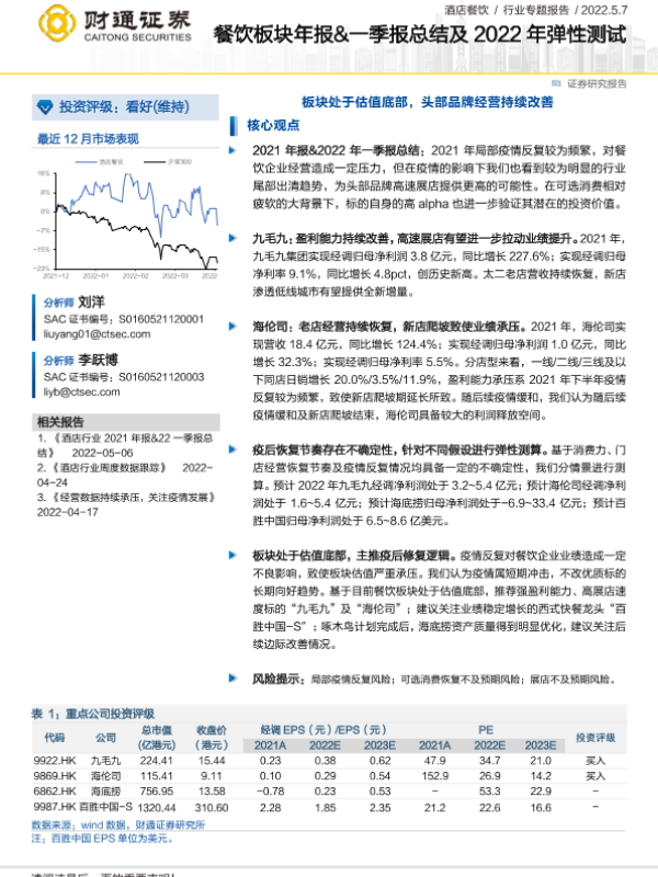 【财通证券】【20220507】餐饮板块年报&一季报总结及2022年弹性测试:板块处于估值底部,头部品牌经营持续改善-20页