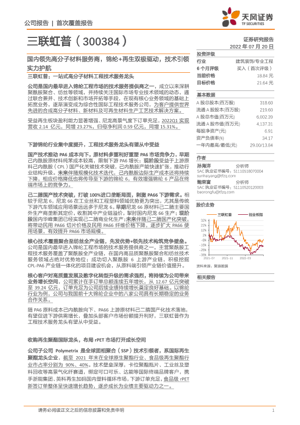 【天风证券】【20220720】国内领先高分子材料服务商,锦纶+再生双极驱动,技术引领实力护航-31页