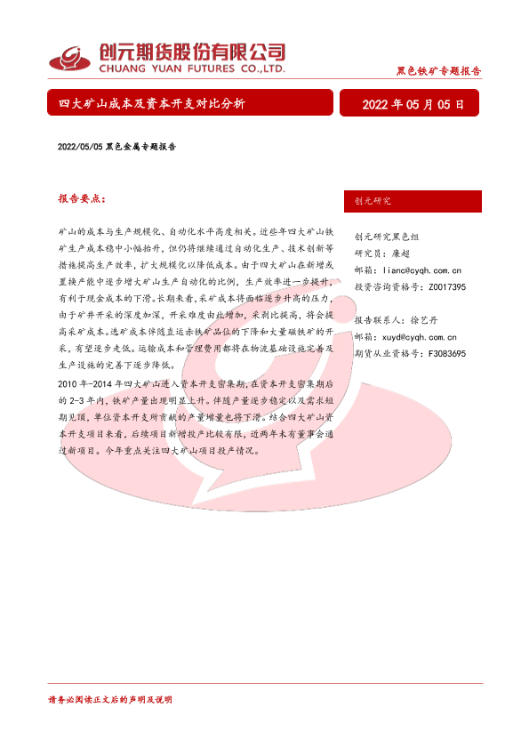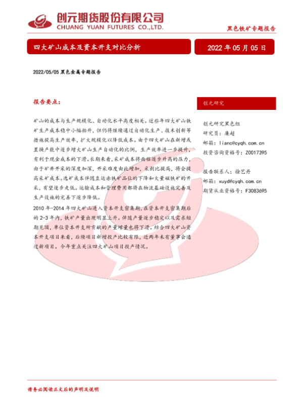 【创元期货】【20220505】黑色金属专题报告:四大矿山成本及资本开支对比分析-28页
