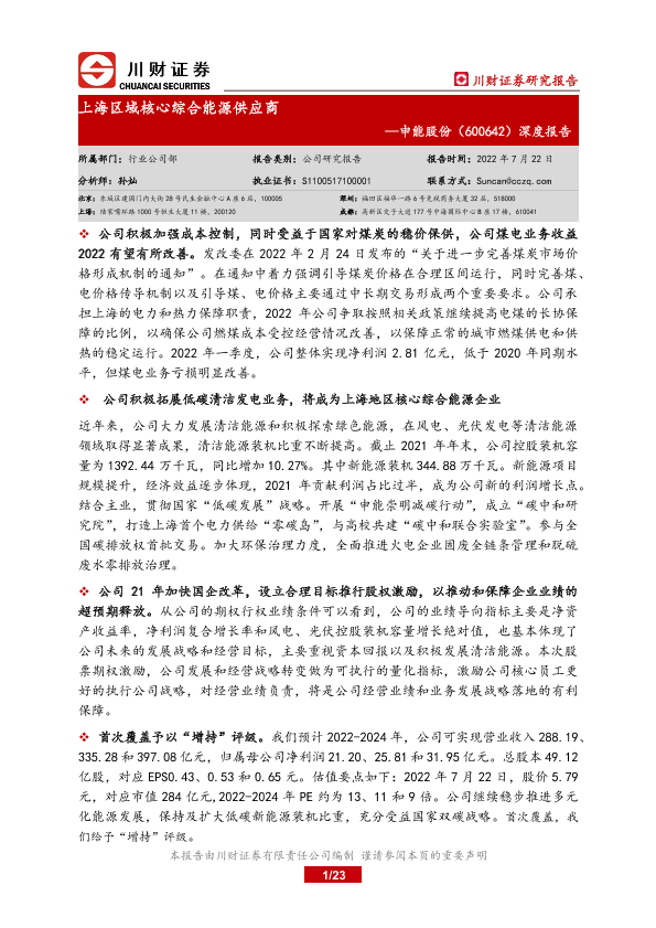 【川财证券】【20220722】申能股份深度报告:上海区域核心综合能源供应商-23页