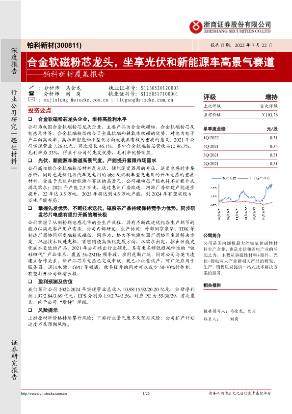 【浙商证券】【20220722】铂科新材覆盖报告:合金软磁粉芯龙头,坐享光伏和新能源车高景气赛道-26页