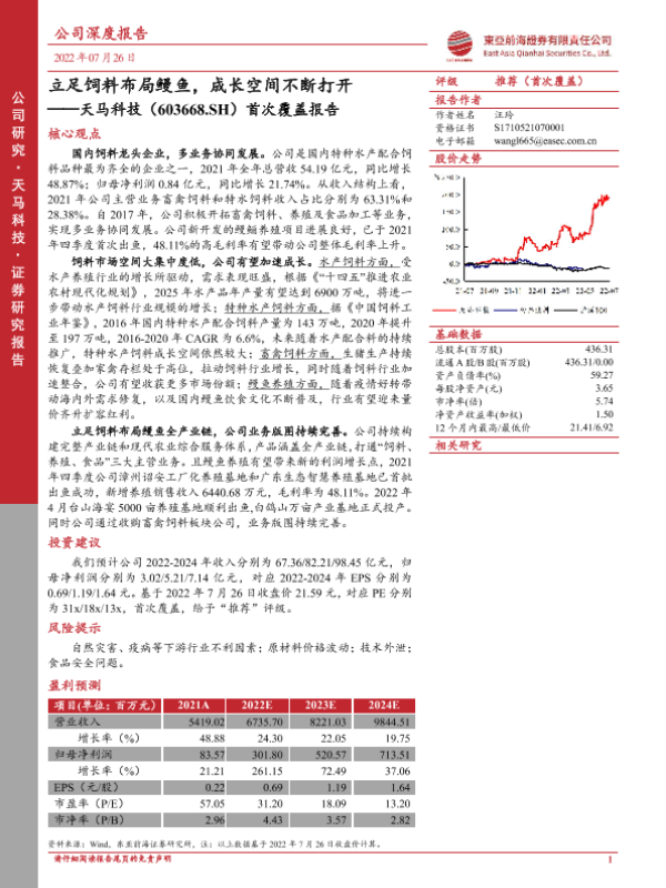 【东亚前海证券】【20220726】20220726-东亚前海证券-天马科技-603668.SH-首次覆盖报告:立足饲料布局鳗鱼,成长空间不断打开-24页