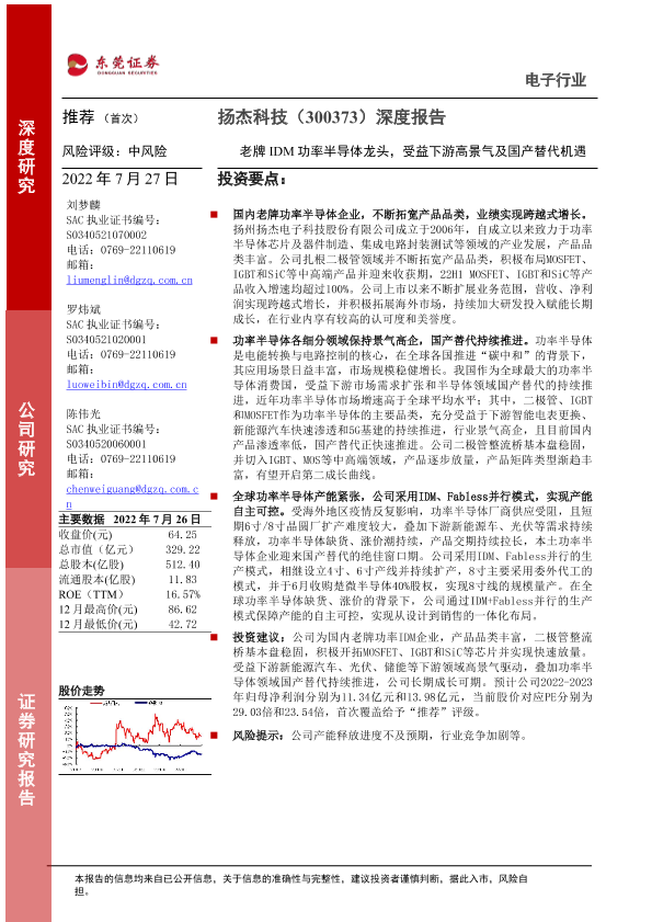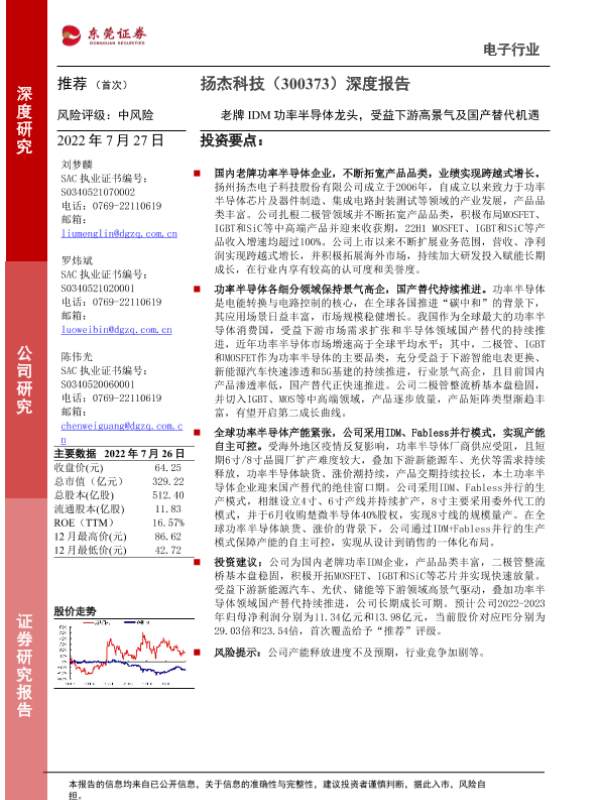 【东莞证券】【20220727】20220727-东莞证券-扬杰科技-300373.SZ-深度报告:老牌IDM功率半导体龙头,受益下游高景气及国产替代机遇-37页