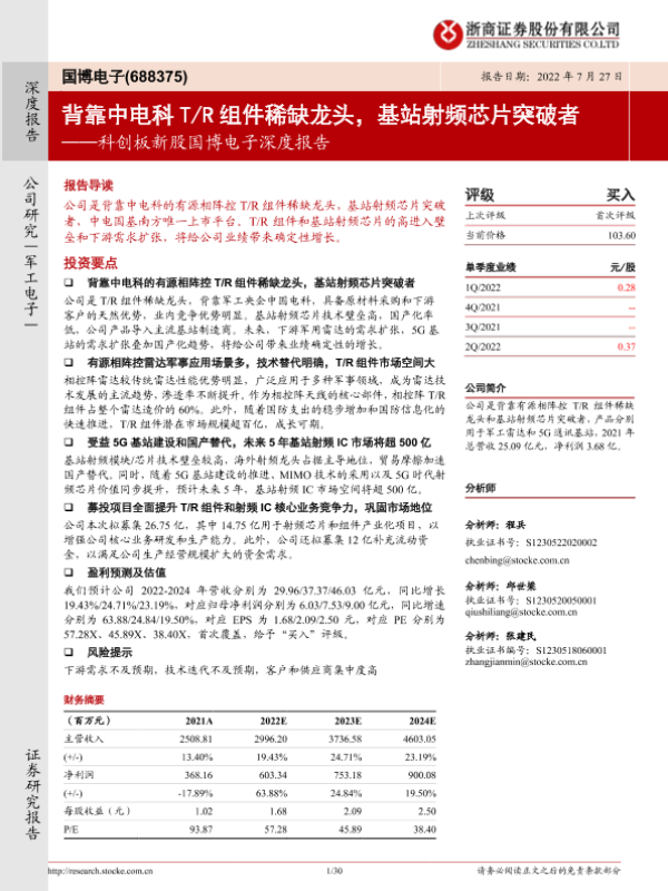 【浙商证券】【20220727】科创板新股国博电子深度报告:背靠中电科T/R组件稀缺龙头,基站射频芯片突破者-30页