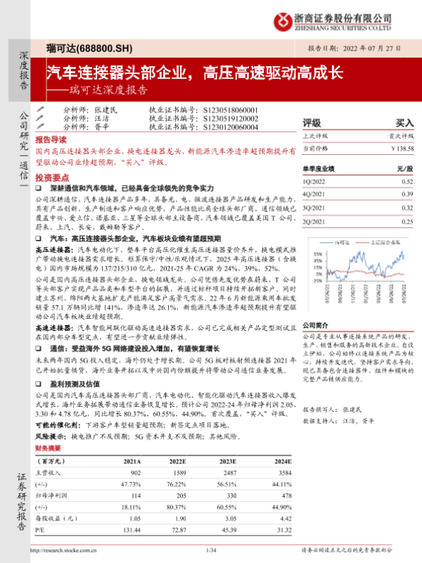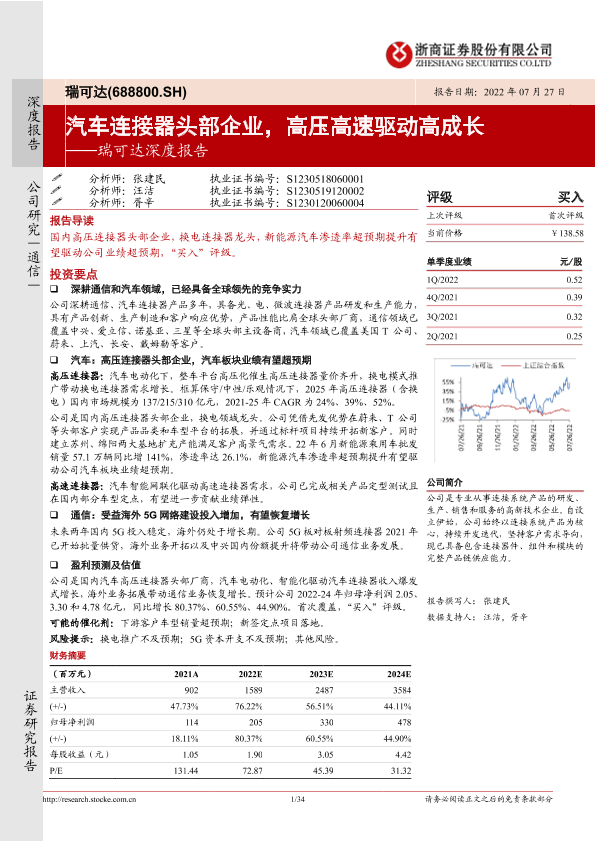 【浙商证券】【20220727】瑞可达深度报告:汽车连接器头部企业,高压高速驱动高成长-34页
